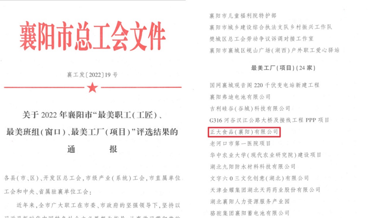 為廣泛開展美好環(huán)境與幸福生活共同締造活動,評選為襄陽市經(jīng)濟(jì)社會高質(zhì)量發(fā)展做出積極貢獻(xiàn)的單位和群體及個人,襄陽市總工會開展了尋找襄陽市“最美職工(工匠)、最美工廠(項目)、最美班組(窗口)”的活動。歷時2個月的多輪評定,襄陽市總工會決定授予正大食品(襄陽)有限公司——襄陽市“最美工廠(項目)”獎項。